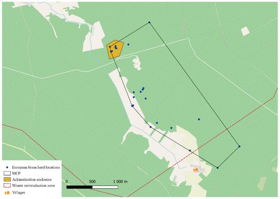 For the needs of the project, an acclimatisation enclosure of 4.5 ha was built in the central part of the forest–meadow landscape in a predefined home range of this herd (Figure 1). The enclosure, made of wooden poles, was additionally secured with an electric fence. Within the enclosure, a water reservoir and necessary infrastructure elements including a water pool, feeders, and storing and feeding racks were built.