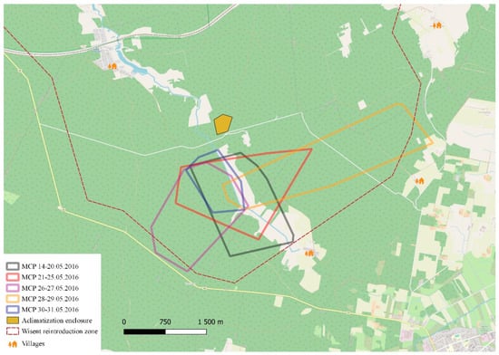 In the first period after the release of the European bison, changes in the occupied area, which occurred every few days, could be explained in several ways. However, they were probably a result of similar exploratory behaviour observed in European bison from different populations. Changes in the area every few days may represent the way European bison learn about a new habitat, as also observed in other reintroduced herds [20,24].