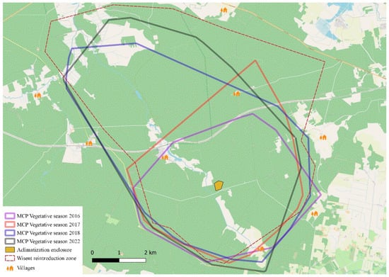 In the first year of monitoring, the area of kernel 95% accounted for 30% of the MCP area. In subsequent summer seasons, this ratio increased to 35%, subsequently remaining at this level. The borders of the area were 3.7 km to the east and 7.5 km to the north from the acclimatisation enclosure. To the west and south, the border of the area was marked by a national road running 3–3.6 km away from the acclimatisation enclosure.
