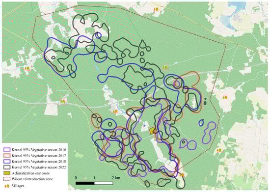 The studies did not include the years 2019–2021 because collar failures prevented the continuity of telemetric monitoring. The analyses were performed in the Quantum Gis 3.22 spatial information system. On the basis of the data, the range of the area was calculated using the minimal convex polygon and kernel 95% methods [21,22]. The value of daily movement was determined as the sum of 24 measurements (interval 1 h), performed on each day of monitoring. The average daily distance was calculated for each season. The greatest distance in a straight line between the herd and the acclimatisation enclosure in each season was also determined. The distances from the acclimatisation enclosure were compared separately for the summer seasons (2016, 2017, 2018, and 2022) and winter seasons (2016/2017, 2017/2018, and 2018/2019). The Kruskal–Wallis test was used, due to the lack of normality distribution of data [23].