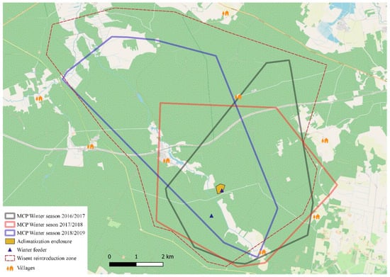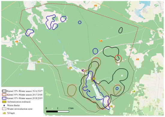 As in the case of the MCP area, the change took place in the winter of 2018/2019. The population spent most of the winter within the northern borders of its new area, which accounted for 32.6 km2 (MCP). The European bison activity was concentrated in the southern and northern parts of the home range, across an area of only 3.9 km2. This coincided with a much lower level of daily movement, with average of 1723 m (SD ± 1543 m). The border of the winter area was 7 km from the acclimatisation enclosure (Table 3).