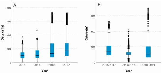 The distance from the enclosure in the summer seasons increased every year, and all seasons were significantly different (p < 0.001, χ2 = 1366.4, df = 3). A noticeable change between the 2017 and 2018 seasons could be observed. A statistically significant decrease in the distance from the enclosure occurred in the 2016/2017 and 2017/2018 (p < 0.001, χ2 = 437.0, df = 2), and then stabilised later on. In the subsequent season of 2018/2019, the distances from the acclimatisation enclosure were smaller than in the first season of 2016/2017, but did not differ from those in the 2017/2018 season (Figure 8).