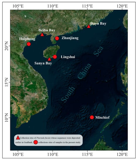 The genus Pinctada Röding, 1798, a group of pearl oysters in the class Bivalvia and family Pteriidae, is found in a broad range of environments spanning from the Indo-Pacific to Western Atlantic tropical and subtropical regions. They are predominantly associated with shallow-water habitats, particularly reef environments [7]. Pinctada fucata (A. Gould, 1850), also known as Pinctada fucata martensii (Dunker, 1880) or Pinctada martensii (Dunker, 1880) (https://www.marinespecies.org/aphia.php?p=taxdetails&id=397170, accessed on 8 April 2023), is an economically valuable bivalve species that is endemic to the coastal waters of the Pacific Ocean between the Tropic of Cancer and the Tropic of Capricorn [8,9,10]. This species is mainly cultivated for pearl production in Asia, especially in Korea, China and Japan [9,11,12]. Mischief Reef is located in the eastern Nansha Islands of China (Figure 1). In recent decades, with increased development in Mischief Reef (reclamation, aquaculture and fishery), the species of Pinctada have changed in this area. According to previous research by Wang and Chen [13], P. maculata was the sole species of the genus Pinctada found in the sea area surrounding the Nansha Islands. However, a recent sampling conducted at Mischief Reef revealed that P. fucata was also present (Figure S1). We found that P. fucata tended to aggregate in groups at coral reefs and attach to the nets of aquaculture cages. According to the observations of local fishermen, the presence of P. fucata in Mischief was initially recorded in 2016. While no substantial ecological or economic issues have been reported due to the presence of P. fucata in the Mischief Reef area to date, it remains unclear whether the introduction and potential proliferation of this species may cause any detrimental effects to the reef’s ecosystem in the future. Because it may be considered a potential invasive species to the Nansha Islands, it is necessary to describe the new record of P. fucata in Mischief Reef and estimate the population genetic diversity and structure of the P. fucata populations.