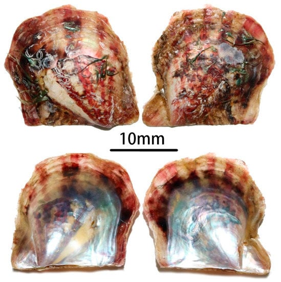 - Hynd, J.S. A Revision of the Australian Pearl-shells, Genus Pinctada (Lamelli-branchia). Mar. Freshwater. Res. 1955, 6, 98–138. [Google Scholar] [CrossRef]