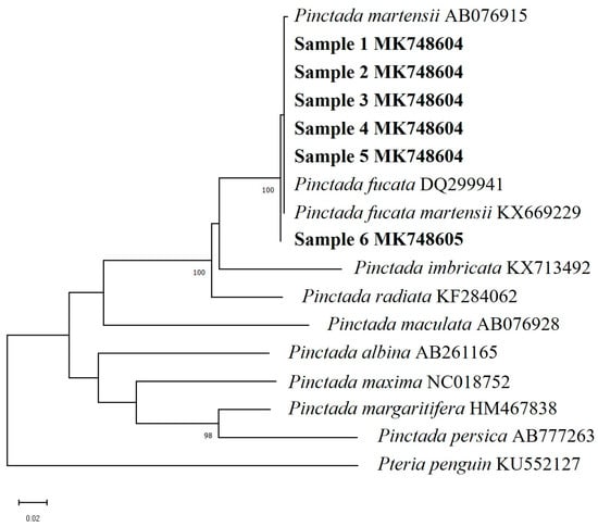 The obtained sequences were subjected to revision using DNASTAR software (DNASTAR, Madison, WI, USA). To confirm the classification status of our samples, eight COI sequences of Pinctada species were downloaded from GenBank and included in the phylogenetic tree study (Table 1). To root the tree, Pteria penguin (Röding, 1798) was selected as the outgroup. The neighbour-joining (NJ) tree was constructed using MEGA 5.0 [26] under the Kimura 2-parameter (K2P) model [26,27].