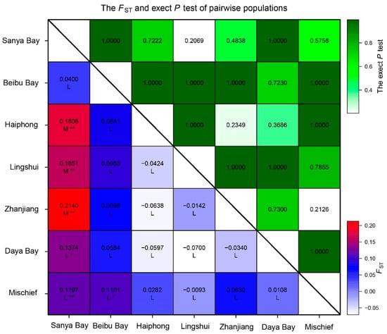 Heatmap of Fst (right, below diagonal) and exact P test (left, above diagonal) values of P. fucata. *: p < 0.05, **: p < 0.01.