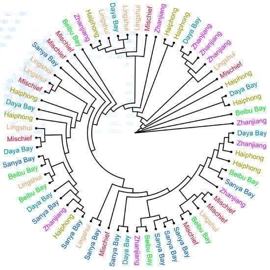 In our study, we investigated the population genetic differentiation of six native P. fucata populations and one Mischief Reef population. The Fst values and ML tree revealed that the differentiation among P. fucata populations was small. Previous studies have suggested that the P. fucata populations in China could be considered a group [44]. We also found that many pairwise Fst values were negative, indicating that differentiation between populations was very small [45]. For instance, the population sampled from Shenzhen showed negative Fst values with four populations. This phenomenon may be explained by mixed germplasm resources resulting from mass hybridization and transport during the development of P. fucata aquaculture [25,46]. More importantly, it is noteworthy that among the six native populations, only the Lingshui population had a negative Fst value (−0.0093) with the Mischief Reef population. Our results hinted that Lingshui had a very close relationship with P. fucata in Mischief Reef.
