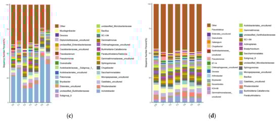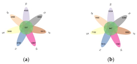 The TruSeq Nano DNA LT Library Prep Kit from the Illumina Corporation was used to create the sequencing library. The double terminal sequences were paired using the Flash Programme (v1.2.7, http://ccb.jhu.edu/software/FLASH/ accessed on 19 March 2023) [] after being mass-screened for overlap-ping bases. Finally, the connected sequence recognition was given to the corresponding sample based on the Index information corresponding to each sample, and the effective sequence of each sample was received. The sequence obtained above was combined, divided by 97% sequence similarity, and the sequence with the greatest abundance in each operational taxonomic unit (OTU) was chosen as the representative sequence of the OTU using QIIME software and the sequence alignment tool UCLUST []. The species annotation analysis was performed using the SILVA database (Release 115, http://www.arb-silva.de accessed on 19 March 2023) [], and after that, the data for each sample were homogenized.