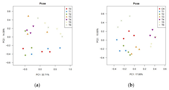 The community structures of soil bacteria were evaluated using principal co-ordinates analysis (PCoA) (Figure 2). Soil bacterial communities clustered to a certain extent according to different treatments in 2019 (Figure 2a). PCoA ordination revealed distinct differences in the bacterial communities among different fertilizer treatments after two years of fertilization treatment. Soil bacterial communities strongly clustered according to different treatments in 2020; T4 and T5 in particular showed a clear separation from the other fertilization regimes (Figure 2b).