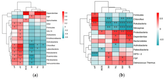Spearman’s correlation between bacterial communities and soil properties in 2019 (a) and 2020 (b) under different fertilizer treatments. *** represents p < 0.001, ** represents p < 0.01, * represents p < 0.05.