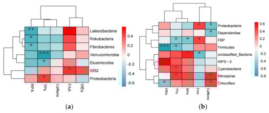 Correlation analysis between bacterial communities and the quality of tea showed that Proteobacteria was positively correlated with TPs and Verrucomicrobia was negatively correlated with TPs in 2019 (Figure 5a). Latescibacteria was positively correlated to FAA, but had a negative correlation with Ratio of polyphenols to amino acids (Figure 5a). In 2020, Proteobacteria was positively correlated with FAA, but negatively with Caffeine (Figure 5b).