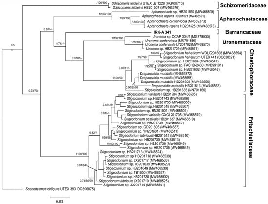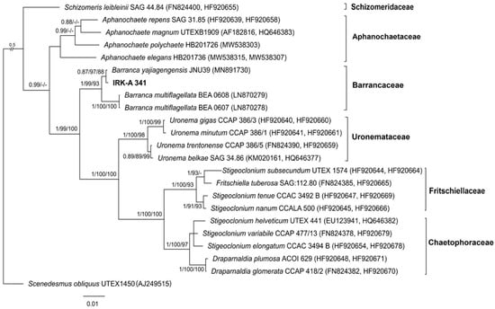 The phylogenetic position of the studied strain IRK–A 341 in the Barranca clade of Chaetophorales. Bayesian phylogenetic tree is based on the 18S-ITS2-28S alignment, 2627 nt in length. Bayesian probability support and bootstrap values (PP/ML/NJ) are given next to branch nodes. Values less than 85 (0.85) are not shown. The studied strain is marked with bold font. GenBank accession numbers are given in parentheses. The scale bar indicates the number of substitutions per site. Scenedesmus obliquus is shown as outgroup.