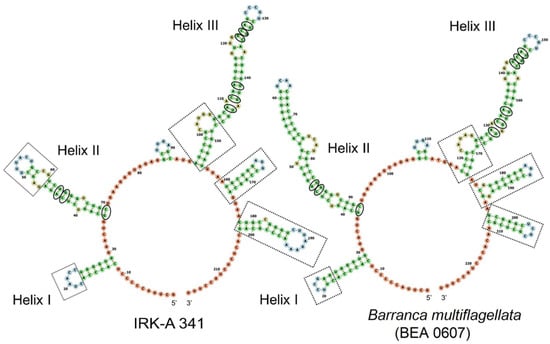 ITS2 secondary structures of Barranca strains. Regions (tips of Helices I and II, basal part of Helix III and two additional helical structures) which are variable between the studied strain IRK–A 341 and Barranca multiflagellata BEA 0607 are highlighted with dotted lines. Count of nucleotide positions starts from 5′ end of ITS2. Common for Chlorophyta sites of CBC in conservative parts of Helixes II and III are ringed (no specific CBCs in Barranca). Structures with minimum free energies (dG) −37.05 for IRK–A 341 and −58.27 for BEA 0607 were compared.