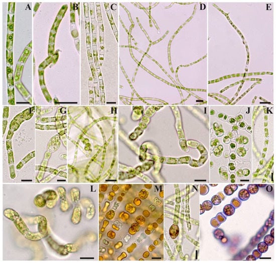 Morphology of filaments of the strain IRK–A 341 on the different stages of development. (A–O). Filaments of different shape and age; cells of different shape and sizes. (B,D,E). Branching. (F–H,J). Filaments with dividing cells, and forming two or more rows of cells. (K). Fragmented filaments with the formation H-pieces. (M–O). Resting cells of different shape. Scale bars: (A–C,F–O)—10 µm, (C–E)—20 µm.