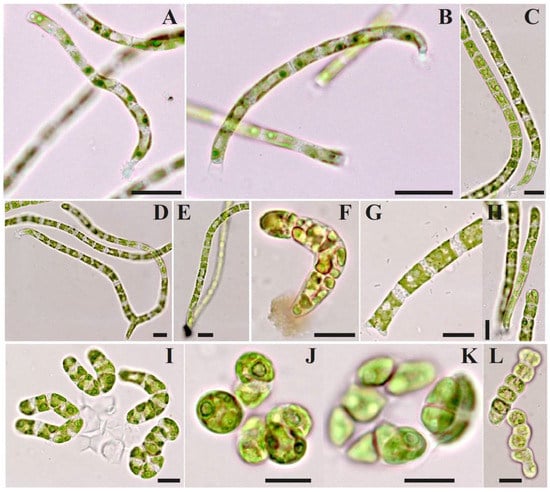 Growing filaments and cell aggregates of the strain IRK–A 341. (A–H). Filaments with the apical-basal polarity. (A–D,F–H). Filaments with a holdfast and/or ring-like structure. (I–K). Germinating cells from resting or vegetative cells. (L). Filaments similar with protococcalean algae. (A–E,G–L). The culture from mineral medium. (F). The culture from soil medium. Scale bars: (A–E,H)—20 µm, (F,G,I–L)—10 µm.
