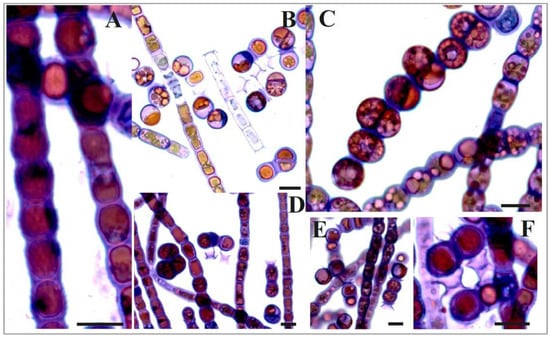 In the growing filaments, young cells have a thin and smooth cell wall. The aging cells have a thickening cell wall. It is homogeneous or stratified in the older cells (Figure 6). The staining with gentian violet inferred that the cell wall of older cells is not smooth. The outer layers of the cell wall rupture over time, and the cell wall of such cells looks spiky (Figure 6A). Cells with thickening cell walls germinate after being placed in a fresh medium (Figure 5). Filament cells grow intercalarily. When vegetative cells elongate and/or divide, the outer layer of the mother cell wall breaks. Remnants of the mother cell wall are visible as the cap at the end of filaments or as H-pieces (Figure 4K, Figure 5B,I and Figure 6B,D–F). Sometimes they resemble the caps of the Oedogonium species. Remnants of maternal cells are uneven at the edges, where the shell bursts. Edges of these caps can band outwards, and they become noticeable even in the middle or inner parts of the actively growing filaments (Figure 6B,E,F). Some aging vegetative cells of filaments are eventually filled with starch and oil droplets. Their contents become granular or relatively homogeneous, and orange. The cell wall is thickened, sometimes red-brown or brown. These cells can be considered as akinete-like or resting cells (Figure 4M–O, Figure 5F and Figure 6). In a fresh medium or water, they leave filaments through lateral pore or breaking of the cell wall, and germinate. Remnants of maternal cells in the form of quadrangular or octagonal caps are well noticeable in the culture for a long time (Figure 5I and Figure 6B,D).