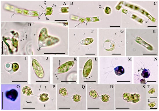 Reproductive and vegetative cells of IRK–A 341. (A–C) Liberation of zoospores from mature filament cells. (A,B,D–I,M–O) Zoospores of the different shape. (N) Zoospore with more than four flagella. (I–L,O) Static zoospores without flagella. (E,P–U) A merging of two halves of one cell or crossing (?). (M–O) Stained with gentian violet. Designations: cv—contractile vacuole; f—flagella, h—holdfast; p—papilla, py—pyrenoid; s—stigma (eyespot); z—zoospore. Scale bars: 10 µm.