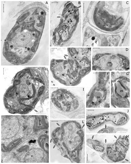 The cell wall of individual vegetative cell is two-layered: the thin outer lamellar layer and inner fibrillary (Figure 8A,C,F). The outer multilayered fibrillary sheath, covering the filaments is often stratified. Fibrillar caps are visible at the ends of the cells (Figure 8A,B,H,I). Possibly, they are remnants of maternal cell wall after intercalary growth (Figure 8I,M). Cell division occurs at different angles to the filament growth axis, sometimes perpendicular to the long axis of the cell (Figure 8,C,J) or at an angle of 45 grades or more (Figure 8B,E,L,M). Most of the observed cellular profiles are more or less constricted on one side (Figure 8A,F,H). An oval or elongated nucleus with a centrally positioned heterogeneous nucleolus is observed at the cell center (Figure 8A,D,H,J). The nucleus is of a simple chromocentric type (Figure 8A,D). Usually a pair of Golgi bodies (Figure 8D,E,K) and some vacuoles (Figure 8A,K) are seen near the nucleus. Mitochondria are located along the chloroplast lobes. They have small oval, rarely elongated profiles (Figure 8A,H). A chloroplast occupies just one half of the cell. It is lobed (Figure 8A,B,E,H,I,M). Some of its profiles are located peripherally, along the cell wall, some are more centrally. In young forming cells, it is parietal (Figure 8C,J,L). Chloroplast thylakoids are long, stretched along the long axis of the cell, and organized in packs mostly of two or three units (Figure 8A,F,G,K). Sometimes short profiles of thylakoids could be seen (Figure 8K). The pyrenoid is embedded in the chloroplast. It is formed by a dark intact stroma and surrounded by 3–4 starch plates (Figure 8B,E,G,I,J). In rare cases, the starch envelope is not formed completely, and the pyrenoid looks naked and comes outside (Figure 8A,F,H). Thylakoids do not cut the pyrenoid stroma, they terminate on its periphery (Figure 8F,G).
