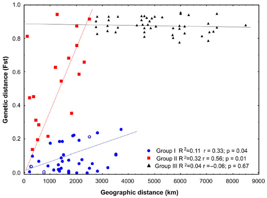The relationship between long-sequence genetic differentiation and geographic distances indicates three rookery clusters (Figure 2). The first includes differences between relatively close areas <2000 km (except for GUCB and IJCB), which increased with geographic distance (group I; r = 0.33, p = 0.04). The second group (II) included comparisons between GUCB and IJCB and between those two and the rest of the Western Caribbean populations. In this case, a steep rise in genetic differences with geographic distances was found despite the short distances involved. The third (III) involves comparisons between Western and Eastern Caribbean rookeries. The relationship between genetic and geographic distances was insignificant in this case. Nevertheless, these results indicate that the genetic differentiation of GUCB and IJCB does not conform to the general isolation by distance pattern observed for the regional rookeries.
