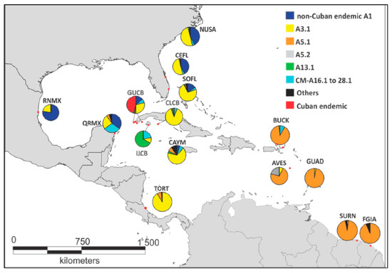 Region-wide patterns are also evident. For example, there is a north-to-south reduction in the most common CM-A1 haplotypes, a predominance of CM-A3.1 in the Central Caribbean, and CM-A5 variants in the southeastern portion of the range.