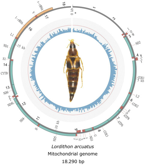 The staphylinid genus Lordithon Thomson has 134 species worldwide, including 73 Palaearctic species [1], which are spread throughout the temperate regions of all continents, excluding Antarctica [2]. Twelve species have been documented in China, the majority of which are found in northern provinces [3]. The current mitogenomic data for this genus available in GenBank come from a European species, L. exoletus (Erichson, 1839) (accession number: KX087309). Here, we present new mitogenome data for an Asian species, Lordithon arcuatus (Solsky, 1871). It is widespread across Northeast Asia, Siberia, and Russia’s Far East [4]. This species currently only has records from Jilin Province in China. [3]. Both Ban et al. [4] and our collection show that L. arcuatus is a mountainous species and can be captured using pitfall traps, flight-interception traps, and sifting from mushrooms. However, it was not present in our collecting funnels for insects that live in the canopy at the same plots [5]. Its association with mushrooms is not evidence of fungivory. Instead, we observed some individuals eating maggots that were present in mushrooms, as summarized by Campbell [2]. In addition, previous studies with different data and models revealed a number of variations in the topologies of staphylinid phylogeny [6,7,8]. In particular, it has been discovered that the site heterogeneity of sequence, which assumes that each site of alignment has undergone uneven evolutionary processes and thus has a specific rate or composition [9,10,11,12,13], has been identified as a significant contributor to the estimation of errors in beetle phylogenetics [14,15]. Therefore, the influence of datasets and models in phylogenetic inference also needs to be addressed, especially the performance of the mixture models, which were created to handle the site heterogeneity of sequences.