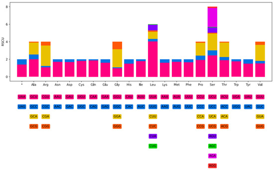 Relative synonymous codon usage (RSCU) of L. arcuatus. The asterisk represents stop codons.
