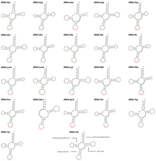 Secondary structure of tRNAs in the mitogenome of L. arcuatus. Red bases on the anticodon arm are anticodon. The number after the abbreviation of amino acid represents tRNAs with different anticodons.