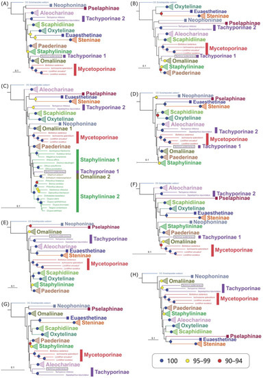 Maximum likelihood trees built under the best model selected according to BIC rankings: (A) AA matrix with mtART+C60 profile mixture model; (B) AA matrix with C60 profile mixture model; (C) P2 matrix with MP scheme; (D) P12 matrix with MP scheme; (E) P123 matrix with MP scheme; (F) P2R matrix with MP scheme; (G) P12R matrix with MP scheme; (H) P123R matrix with MP scheme. The color of the circle at each node represents the bootstrap value (those with BS < 90 are not shown here). Branch length scales are located at the lower left of the trees. The asterisk indicates the species whose mitogenome was sequenced for this study. The “tricky outlier” Tachinus subterraneus is indicated by a black frame.