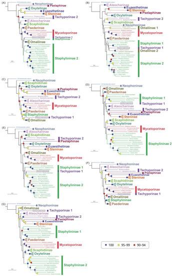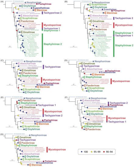Maximum likelihood trees built with class-unlinked heterotachy models: (A) AA matrix with mtART+F*H4 model; (B) P2 matrix with TVM+F+R4*H4 model; (C) P12 matrix with GTR+F+R5*H4 model; (D) P123 matrix with GTR+F+R7*H4 model; (E) P2R matrix with GTR+F+R5*H4 model; (F) P12R matrix with GTR+F+R5*H4 model; (G) P123R matrix with GTR+F+R7*H4 model. Coloring, annotation, and legends are the same as in Figure 4. The “tricky outlier” Tachinus subterraneus is indicated by a black frame.