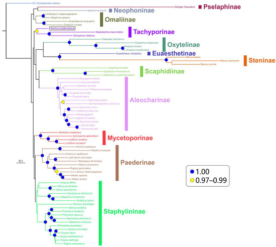 Bayesian consensus tree under the CAT-GTR+G4 model for non-partitioned AA dataset, without clade collapse. Nodes with PP < 0.97 are not shown. Coloring, annotation, and legends are the same as in Figure 4. The tip of Tachinus subterraneus is indicated by a black frame.