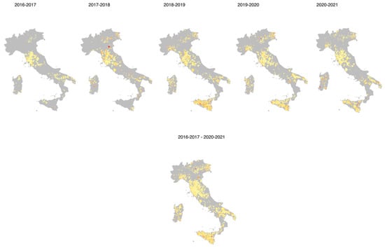 We conducted the analyses considering the municipalities always present in the monitoring seasons, as well as taking into account all the municipalities present over the five-year period.