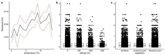 Variation of mean Woodcock abundance (Woodcock ICA, solid line) by temperature (a), dashed red lines correspond to 95% confidence intervals (95% CI) altitude (b) and habitat type (c).