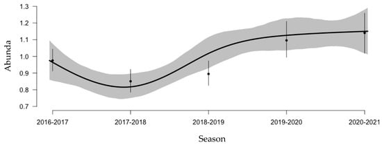 The total abundance of Woodcock decreased between the 2016–2017 and 2017–2018 seasons, but after a significant recovery, in 2018–2019, remained stable until 2020–2021 (Figure 3). For instance, the decrease from 1.0 in 2016–2017 to ~0.8 in 2017–2018 roughly corresponds to a decrease of 20%.