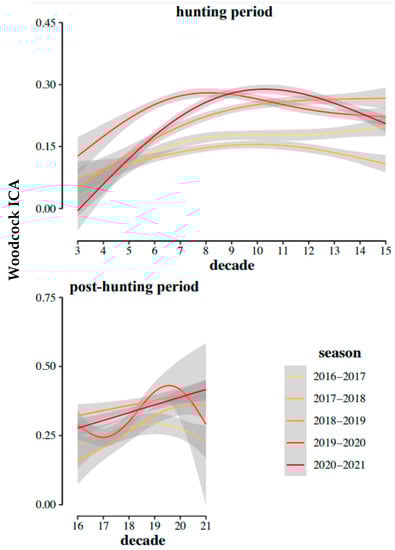 Variation in Woodcock abundance (Woodcock ICA) for each decade (decade 1: 1–10 September, and so on), in both the hunting and post-hunting period, for different seasons (2016–2017 to 2020–2021). The grey areas correspond to 95% confidence intervals (95% CI).