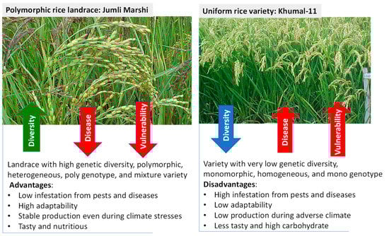 Increased diversity in the field ensures the harvest and minimizes the risk of crop failure due to both biotic and abiotic factors [16,17]. Crop diversity contributes to yield stability and insect and pest resistance/tolerance due to a broad genetic base derived from diverse germplasm sources [18,19]. A few advantages associated with high intra-varietal diversity are given in Figure 1. Jumli Marshi (Figure 1 left) is highly polymorphic and as a result we have observed less disease pressure as well as a low vulnerability to climate-related abiotic stresses. Due to climatic variations and the requirements of different products to meet the preference of clients, the majority of farmers in Nepal grow a large number of crop species and their varieties as well as landraces. Growing varieties of the same crops is easy and also provides multiple benefits. This is very important for sustainable agricultural businesses maintaining a functional agroecosystem. Many farmers are very familiar with the advantages of increased crop diversity in the fields. In many areas, we observed that farmers grow different crop species together as well as mixed populations of varieties and landraces (Figure 2). Some practices of farmers are given in Table 3, along with their advantages. Farmers keep seeds from such mixed populations for the next season, which favors natural selection. Alongside this, they are resilient to climate and other environmental factors [20], including weeds [21], and perform, relatively, better than other newly developed narrow genetic base varieties.
