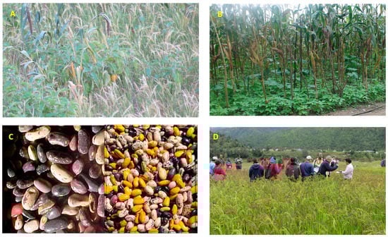 Genetic diversity in the field: (A) Crop mixture (rice + foxtail millet + brinjal and others) in Humla district, (B) three sister crops (maize, pumpkin and bean) in East Nepal, (C) two bean landraces in Jumla and Rukum districts, (D) evolutionary rice population in Jumla district (50 rice landraces).