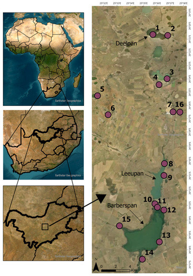 The term “wetlands” groups a wide range of variable habitats, ranging between (semi-)terrestrial and aquatic systems, and which are distributed worldwide. Various factors, such as their hydrological cycle (permanent or temporary), substrate type, salinity, vegetation, or location, allow to distinguish different types amongst them. Owing to the delicate balance between rainfall and evapotranspiration, these areas are highly vulnerable to climate change [1]. Temporary waters, which are the most common type of wetlands in arid regions, are defined by Williams [2] as bodies of fresh water that experience a recurrent dry phase of varying length, making them one of the most unpredictable and seemingly unsuitable habitats in the world. Despite the fact that such waterbodies, commonly known as “pans” in South Africa [3], represent a significant part of the global landscape and have huge importance for the preservation of biodiversity, they are under threat from global climate change and a wide range of human activities [4,5].