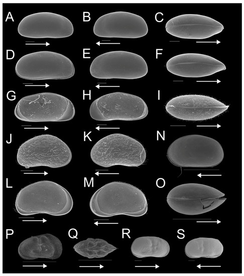 SEM iconography of ostracods found at the studied sites in North West province of South Africa: Heterocypris giesbrechti (A–H); Plesiocypridopsis newtoni (I–M); Hemicypris sp. (N,O); Limnocythere sp. ex gr. stationis (P,Q); Limnocythere cf. inopinata (R,S). H. giesbrechti: (A) male, RV, external view. (B) male, LV, external view. (C) male, Cp, dorsal view. (D) female, Cp, right lateral view. (E) female, LV, external view. (F) female, Cp, dorsal view. (G) female, LV, internal view. (H) female, RV, internal view. P. newtoni: (I) female, Cp, dorsal view. (J) female, RV, external view. (K) female, LV, external view. (L) female, LV, internal view. (M) female, RV, internal view. Hemicypris sp.: (N) female, Cp, left lateral view. (O) female, Cp, dorsal view. Limnocythere sp. ex gr. stationis: (P) female, RV, external view. (Q) female, Cp, dorsal view. L. cf. inopinata: (R) female, Cp, right lateral view. (S) female, Cp, left lateral view. Scale = 500 μm for (N,O); 300 μm for (P,Q); 200 μm for (A–M); 100 μm for (R,S).