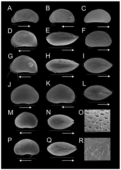 SEM iconography of ostracods found at the studied sites in North West province of South Africa: Potamocypris mastigophora (A–C); Potamocypris cf. deflexa (D,E); Potamocypris meissneri (F); Potamocypris cf. gibbula (G,H); Sarscypridopsis aculeata (I–L); Sarscypridopsis cf. katesae (M–O); Sarscypridopsis elizabethae (P–R). P. mastigophora: (A) female, LV, internal view. (B) female, RV, internal view. (C) female RV, external view. P. cf. deflexa: (D) female, Cp, left lateral view. (E) female, Cp, dorsal view. P. meissneri: (F) female, Cp, right lateral view. P. cf. gibbula: (G) female, Cp, left lateral view. (H) female, Cp, dorsal view. S. aculeata: (I) female, Cp, dorsal view. (J) female, Cp, right lateral view. (K) female, Cp, left lateral view. (L) female, Cp, ventral view. S. cf. katesae: (M) female, Cp, left lateral view. (N) female, Cp, dorsal view. (O) female, detail of surface. S. elizabethae: (P) female, Cp, left lateral view. (Q) female, Cp, dorsal view. (R) female, detail of surface. Scale = 500 μm for (I–N,P,Q); 300 μm for (D,E,G,H); 100 μm for (A,B,F); 50 μm for (R); 20 μm for (C,O).