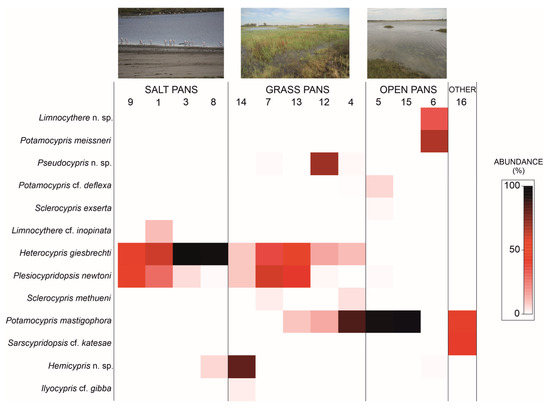 3.3. Ostracod Species and Assemblage Distribution across Pan Types