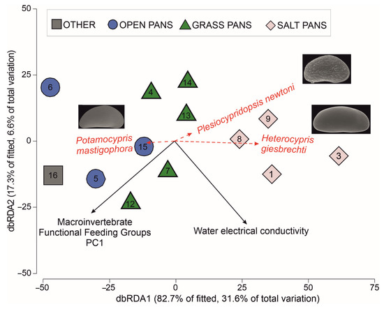 Of the three species selected by the SIMPER analysis as responsible for the pan type segregation, Heterocypris giesbrechti and Plesiocypridopsis newtoni are located on the right side of the plot (Figure 6) and are positively correlated with the dbRDA1 (correlation coefficients 0.767 and 0.160, respectively). These species with high relative abundances are most characteristic for the salt (especially H. giesbrechti) and grass pans. On the other hand, Potamocypris mastigophora, which negatively correlated with the dbRDA1 (–0.256), is situated on the left side of the plot and occurred typically in high percentage abundances in the open pans.