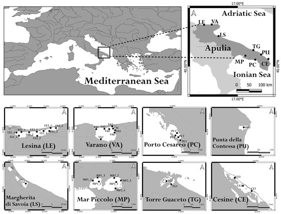 The study was based on the identification and classification of the coastal lagoons of Apulia following the current Italian legislation (Italian Ministerial Decree 131/08). According to it, the investigated area included eight lagoons, two for each salinity class: Cesine (CE) and Torre Guaceto (TG) classified as mesohaline; Lesina (LE) and Varano (VA) as polyhaline; Porto Cesareo (PC) and Mar Piccolo (MP) as euhaline; Margherita di Savoia, only for the part known as “Vasche Evaporanti—Lago Salpi” (LS); and Punta della Contessa (PU) as hyperhaline (Figure 1). A total of 11 T-WBs were considered. In almost all cases, each lagoon comprised a single T-WB, with the exception of LE, divided into three different T-WBs (LE1, LE2 and LE3) and MP divided into two T-WBs corresponding to two well-distinct inlets, called the First and Second Inlet (MP1 and MP2, respectively).