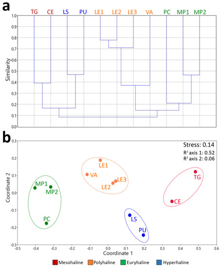 Results of Cluster Analyses (a) and non−Metric Multidimensional Scaling (n−MDS) (b) based on Bray–Curtis dissimilarities between T-WBs of the four salinity classes.