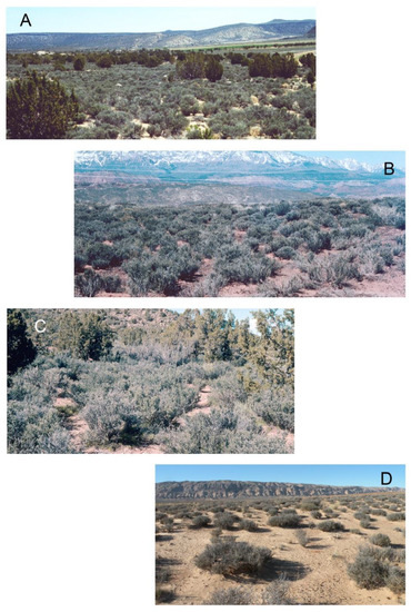 - West, N.E. Colorado Plateau-Mohavian blackbrush semi-desert. In Temperate Deserts and Semi-Deserts; West, N.E., Ed.; Elsevier Scientific Publishing Company: Amsterdam, The Netherlands, 1983; pp. 399–411. [Google Scholar]