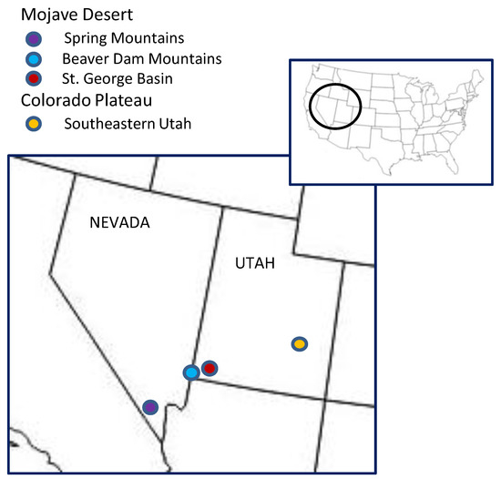 Map of Utah and Nevada in the western United States, showing the four general regions where study sites were located. See Table 1 for specific site locations.