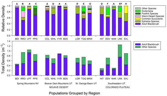 Upper panel: Woody plant community composition expressed as relative density of adult blackbrush, Ephedra species, common succulent species, Gutierrezia sarothrae, foothill species, warm desert species, and other species, Lower panel: absolute density of adult blackbrush and other woody plant species at each of the 16 blackbrush study sites. Relative density frequency distributions headed by the same letter are not significantly different according to a Bonferroni-corrected post hoc χ2 test.