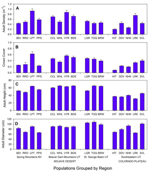 Blackbrush population parameters for 16 study sites grouped by region: (A) adult clump absolute density, (B) total crown cover (proportion of total area), (C) adult clump mean height, (D) adult clump crown diameter. Error bars represent the standard error of the mean. See Table 1 for site names and information and Table 2 for the analysis of variance.