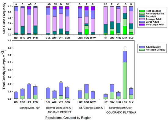 Upper panel: Relative density of clumps in each of six size classes at 16 study sites grouped by region. Relative density frequency distributions headed by the same letter are not significantly different according to a Bonferroni-corrected post hoc χ2 test. Lower panel: Total blackbrush clump density at each site. Error bars represent standard error of the mean for total density. See Table 1 for site names and information.