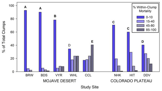 Blackbrush mortality after the 2002 drought at eight study sites, measured as the proportion of each clump that was dead the following spring (2003). Frequency distributions headed by the same letter are not significantly different according to a Bonferroni-corrected post hoc χ2 test. See Table 1 for study site names and information.