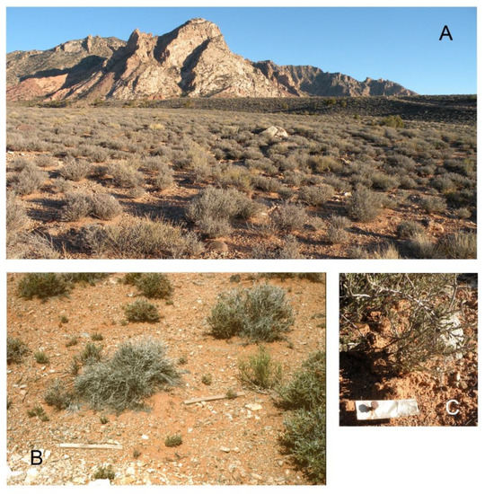 Blackbrush (Coleogyne ramosissima Torr) occurs as a dominant xerophytic shrub species on shallow, infertile soils at middle elevations across much of the Mojave Desert and Colorado Plateau regions of western North America (Figure 1A–D). It is an important ecotonal species in the transition zone between warm and cold deserts, occurring as the dominant species on approximately three million hectares. Coleogyne is a monotypic outlier genus in the small tribe Kerrieae (Rosaceae) and is not closely related to any other desert shrub. It has often been described as a paleoendemic because of its taxonomic isolation and long history in the region [1], but recent studies by myself and my research partners have shown that it has high genetic diversity, with strong ecotypic differentiation across its large geographic range [2,3]. One objective of the present work is to examine how this ecotypic differentiation is expressed in terms of population dynamics at the stand level.